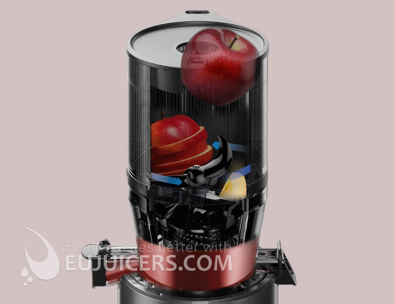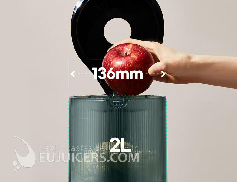 2. Otvor 136 mm pre obrovské Mega zaťaženie: Trikrát väčší vstup ako súčasných 45 mm. Celé jablká a pomaranče, ktoré netreba krájať! Veľkokapacitný 2-litrový Mega nakladač, ktorý naplníte ovocím a zeleninou súčasne. Môžete pridať viac, suroviny môžete pridať kedykoľvek, aj počas lisovania.